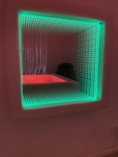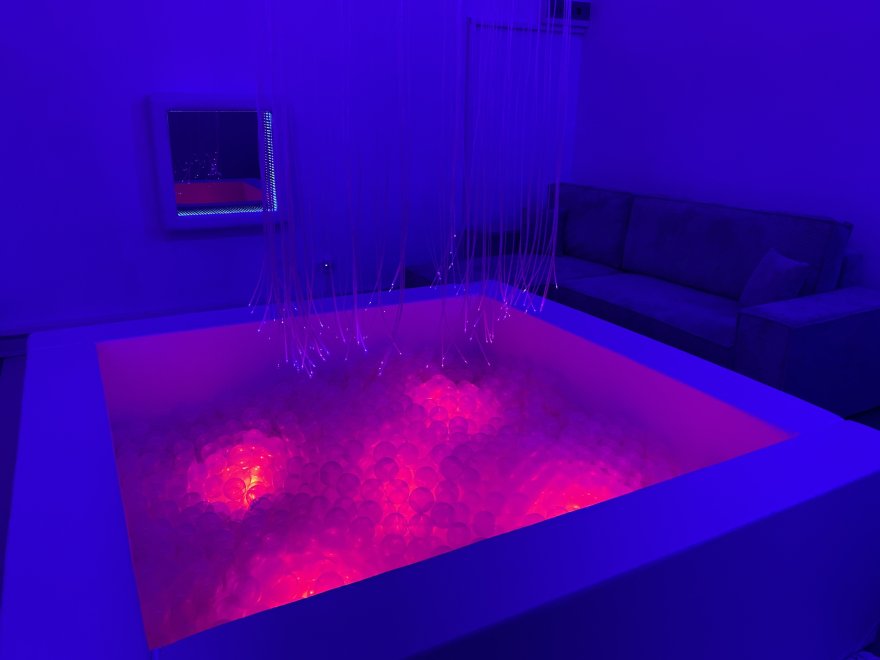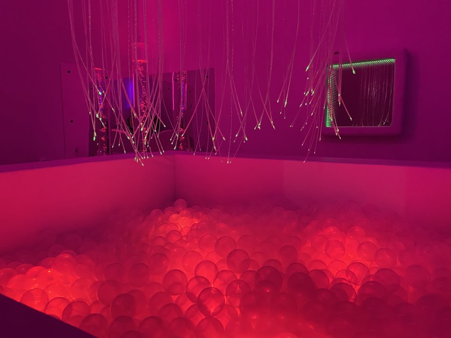 In a former tool shop, a specially designed room was created to provide various stimuli using lighting effects, colors, sounds, music, scents, relaxation activities, and more. This room is both equipped with appropriate equipment and a therapeutic tool for working with students with intellectual disabilities and multiple disabilities. The room is equipped with an illuminated ball pit, a voice-controlled mirror tunnel, a fiber optic canopy, and a mirror corner with a water column.